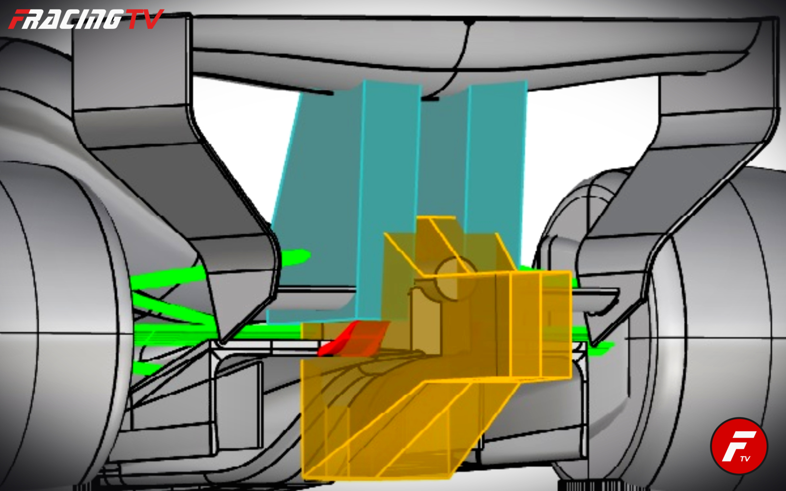 Diverso, invece, il discorso del cosiddetto “diffusore allungato” Ferrari. Qui sembra esserci stata una vera e propria operazione di fino sul regolamento. Le parti della carrozzeria devono infatti rientrare in volumi geometrici definiti con grande precisione. Nella zona posteriore interessata esistono due volumi regolamentari denominati “RV-RW-PYLON” e “RV-RW-TAIL”. Questi due volumi si sovrappongono parzialmente e, se interpretati con astuzia, possono definire uno spazio utile entro cui estendere il diffusore oltre quanto normalmente immaginato.